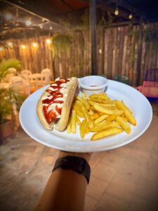 -Hot dog con papas fritas, ideal para compartir o disfrutar al paso.